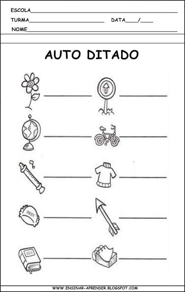 O autoditado é uma atividade que os alunos escrevem a partir de uma figura. É uma forma das crianças praticarem cada vez mais e aumentarem o seu vocabulário. Isso porque a criança escreve e nomeia o objeto o tempo todo, repetidas vezes se for necessário.
