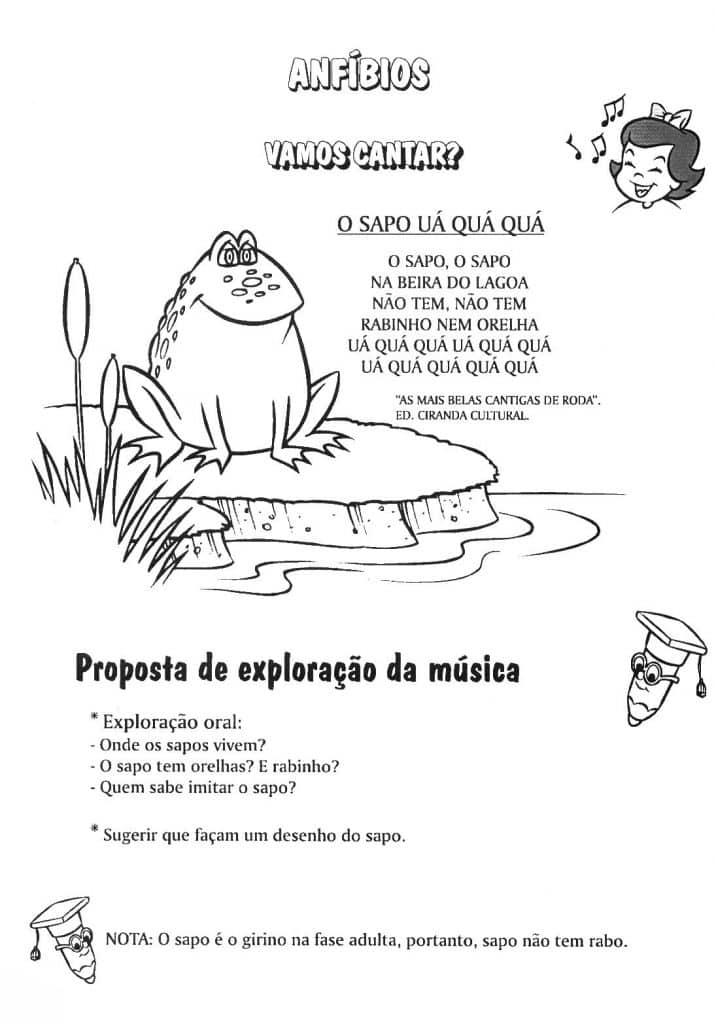 As atividades podem ser para colorir, para ligar, escrever texto e também de música. Essa última pode ser muito útil. Alguns professores não utilizam essa metodologia em sala de aula. Mas, ela faz com que a letra não saia da cabeça das crianças. Com isso, as informações se completam na cabeça delas. Em um dos exercícios, tem a música sobre o sapo e também a exploração de cada palavra da música.