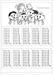 Algumas tabuadas trazem diversos personagens coloridos para atrair ainda mais os alunos e também pode fazer com que eles pratiquem cada vez mais.